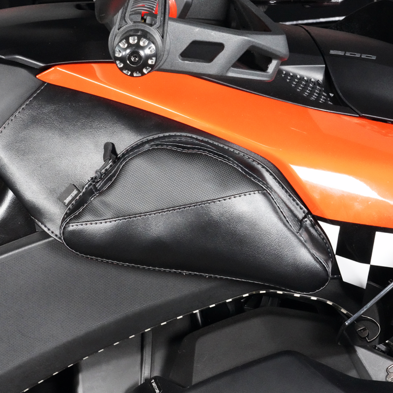 Part Description: Pair of left and right side tank pouches solving the lack of storage on the Ryker Includes a flap to protect the zipper opening to easily accessible pouches Anchors securely to the tank side cover with a felt-backed base Secures using OEM push-pins and hook-and-loop fasteners No drilling required Sold in pairs Made in USA